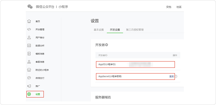 如下图,可以得知自己小程序的ID与密钥,如图所示。