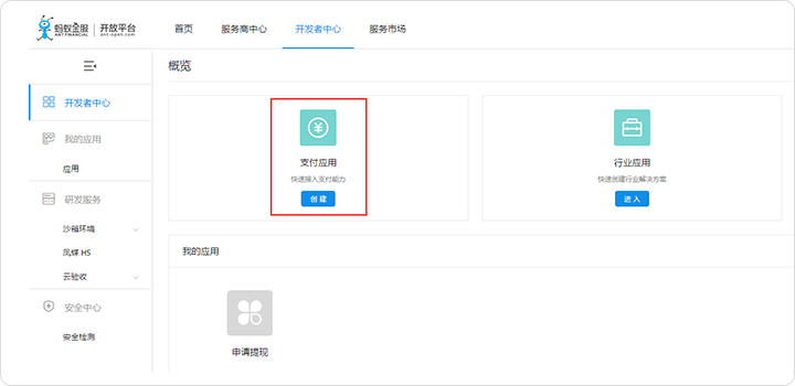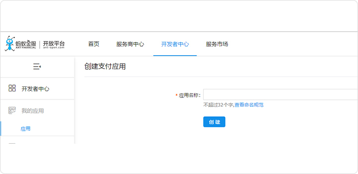 需填写的信息有付款方姓名、支付宝APPID、支付宝公钥和商户私钥。这些信息需登录支付宝开放平台(蚂蚁金服开放平台),登录以后进入开发者中心创建支付宝应用。