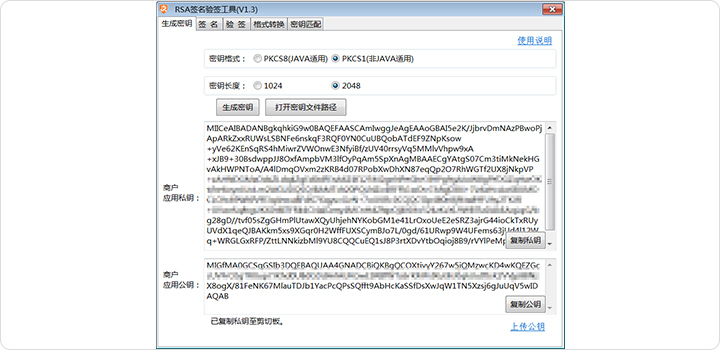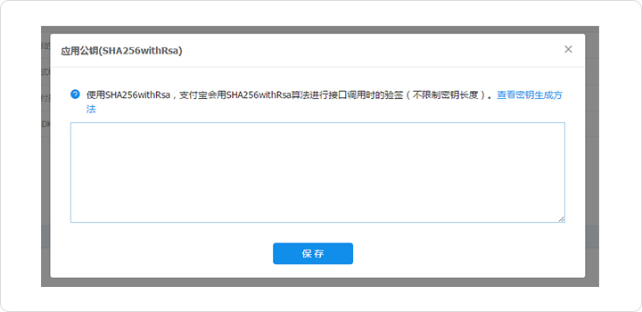 然后填写应用公钥即可,如何填写可点击“查看密钥生成方法”,生成方式请选择密钥方式:PKCS1(非JAVA适用),密钥长度:2048。