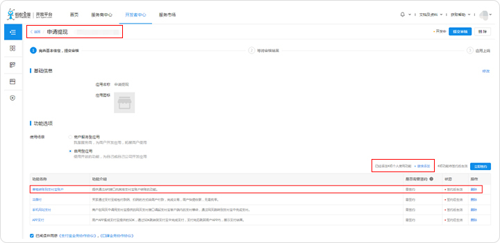 创建以后,进入对应应用页面,页面标题可查看该应用APPID,进入如下页面点击继续添加找到“单笔转账到支付宝账户”选择完成后进行签约。