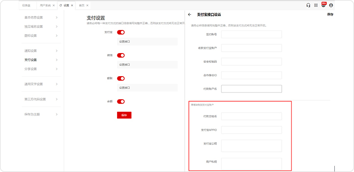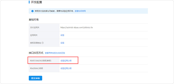 获得商户公钥和商户私钥,将商户公钥填写在支付宝中获得支付宝公钥。然后在响站中填写支付宝公钥和商户私钥。填写完成后提交审核等待审核完成即可。