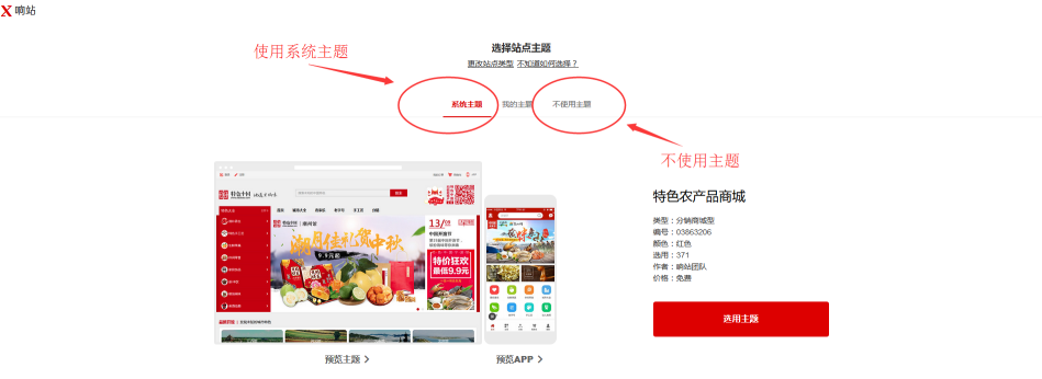 根据个人喜好选择系统自带的主题或不使用主题。(使用系统自带的主题,站点创建成功后自带主题样式,只需要更换相关资料,完善后台设置即可完成网站,不使用主题创建的是空白网站,可以个性化自定义页面的排版和样式)