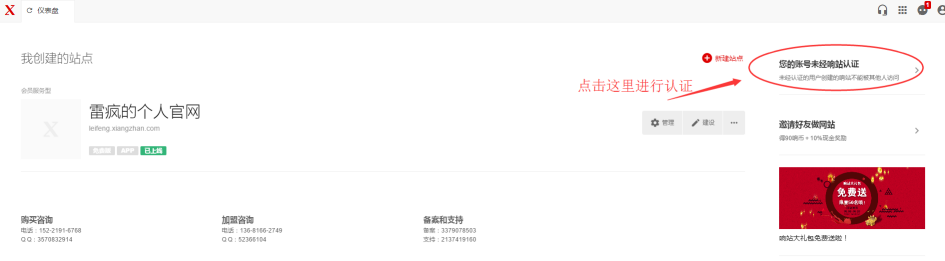 在页面右侧点击“您的账号未经响站认证”,根据需要选择不同认证类型并完善信息。认证完成以后需要响站管理者进行审核通过,审核通过之后,你创建的网站就可以被别人访问了。