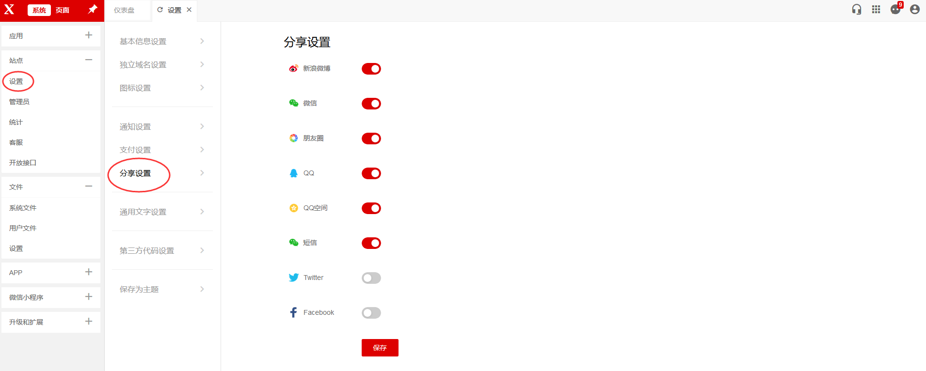 在系统-站点-设置-分享设置中,开启你需要通过哪些平台分享。
