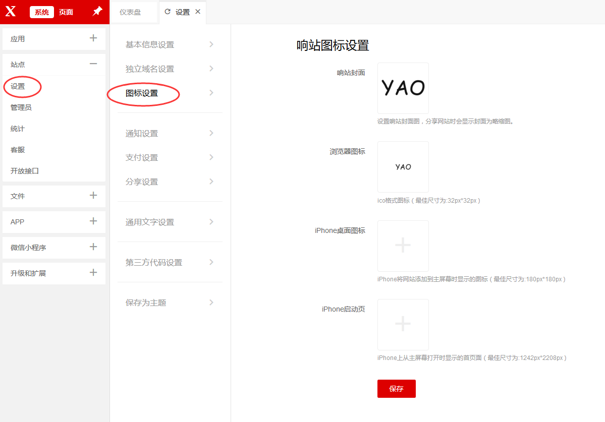 在系统-站点-设置-图标设置中,补充完整响站封面和浏览器图标的设置(注意浏览器图标的格式为ico格式,可以上网在线转化)。