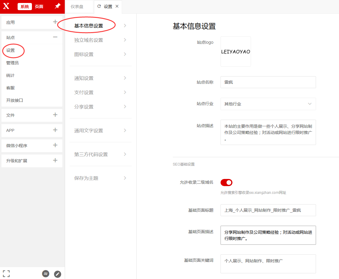 在系统-站点-设置-基本信息设置中,补充完整站点logo、名称、描述、行业以及SEO基础设置。