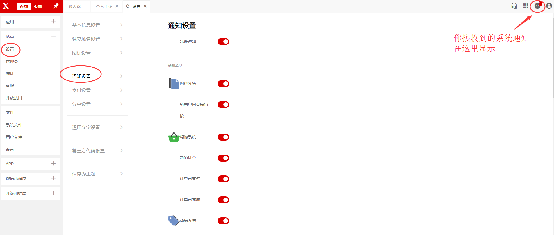 在系统-站点-设置-通知设置中,开启你需要接收到的通知。