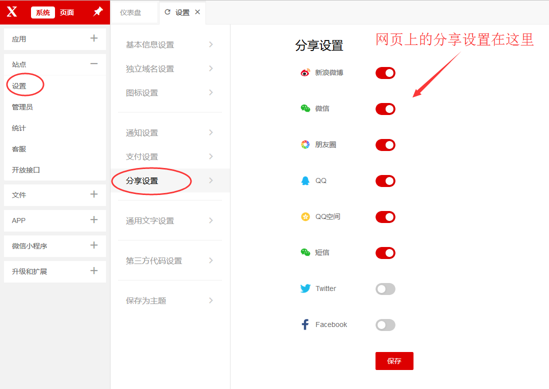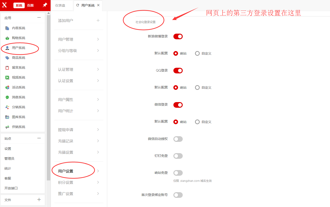 网页上的分享和第三方登录是在响站后台的系统-站点-设置-分享设置中开启需要新浪、微信、朋友圈等。在系统-应用-用户系统-用户设置-社会化登录设置中开启新浪微博登录、QQ登录、微信登录等。默认使用响站的接口。