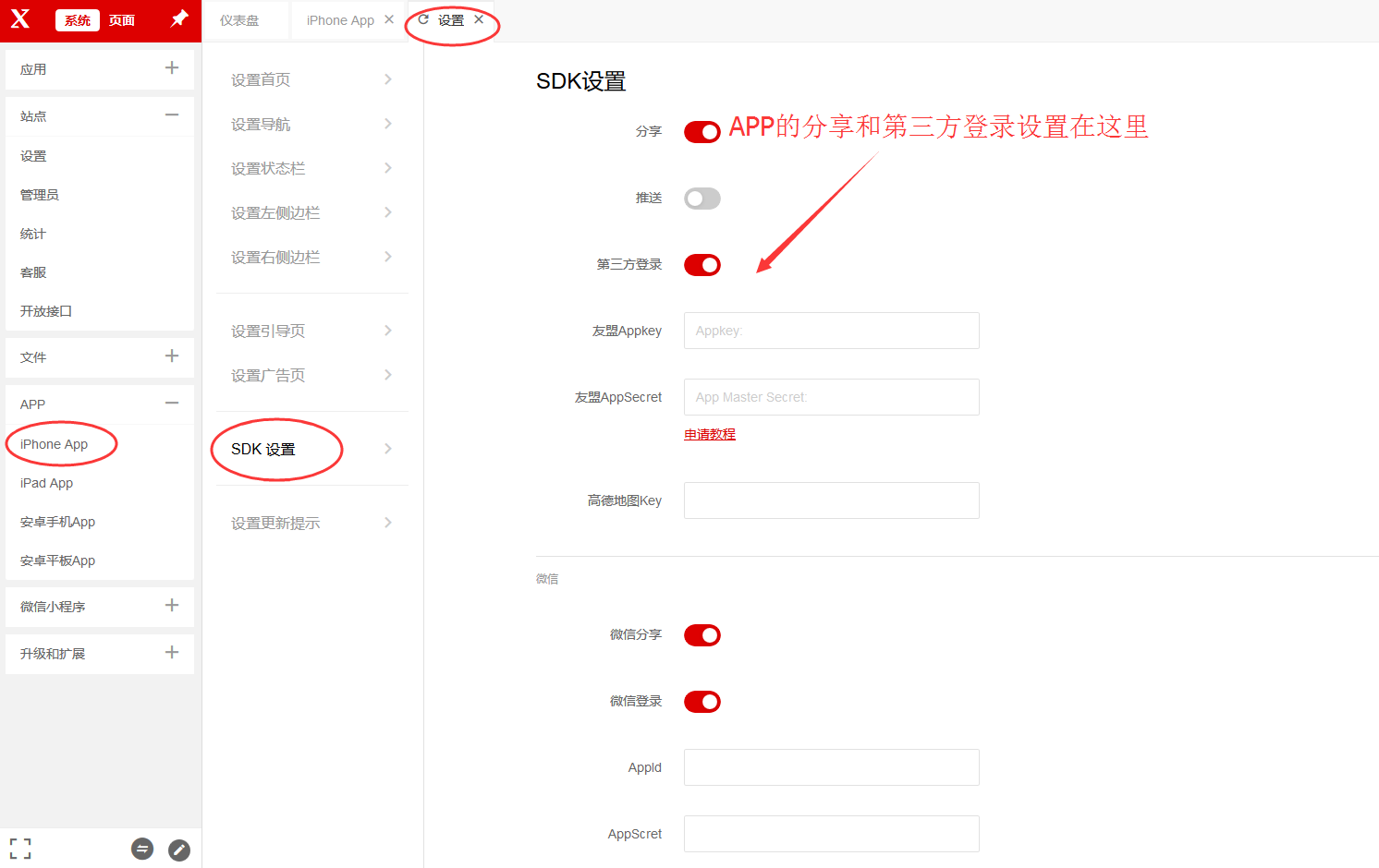 APP上的分享和第三方登录,以iPhone App为例,在响站后台在系统-APP-iPhone App-设置-SDK设置中开启分享、推送和第三方登录,并填入友盟、新浪微博、微信、QQ等接口。