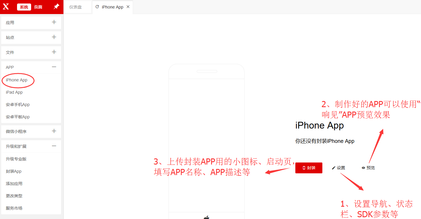 首先,你需要制作好APP页面;接着以iPhone App为例,在系统-APP-iPhone App-设置中,设置好首页、导航、状态栏和SDK设置;制作好的的APP可以在应用市场下载“响见”进行预览;然后在系统-APP-iPhone App-封装中,上传APP图标、启动页、APP名称和描述并完成。