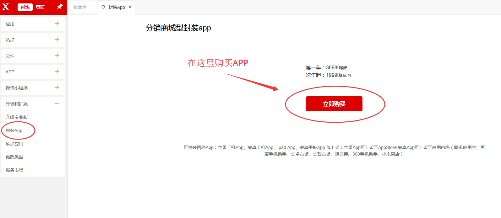 在响站后台的系统-升级和扩展-封装APP选择“立即购买”,一般需要封装的APP是带购物功能的。