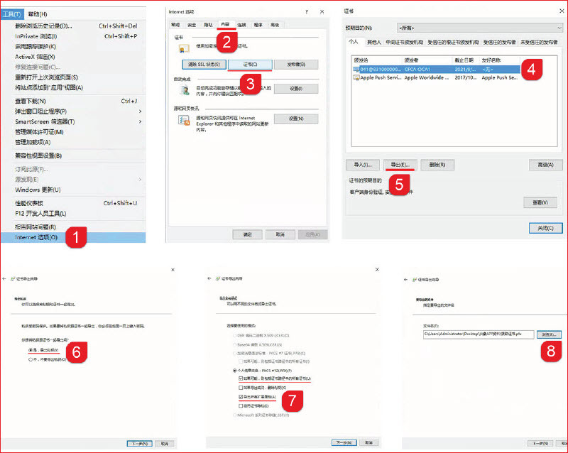 在电脑上打开Internet Explorer浏览器,然后打开浏览器的Internet 选项窗口。在内容标签下点击证书按钮。然后在证书窗口中选中刚才下载的、由CFCA签发的银联证书。点击导出按钮,在导出向导窗口中选择导出私钥,导出所有扩展属性,设置6位由数字和字母组成的密码,选择导出文件的保存地址和填写文件名,最后点击完成。(操作如下图所示)
