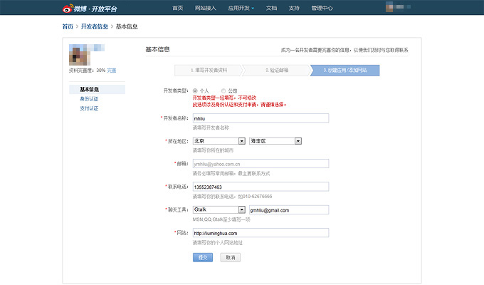 请在开发者信息设置页填写真实资料。成为微博认证的开发者,你需要通过邮箱验证和手机验证。我们会给你填写的邮箱和手机号发送验证信息,请根据提示验证你的身份。