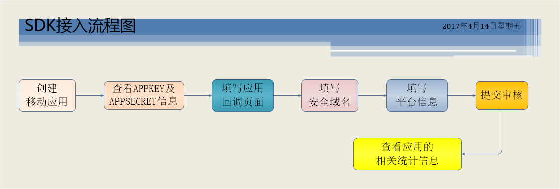下载并集成对应平台SDK到你的应用中,当您开发完您的应用后,您就可以通过“我的应用”页面提交审核了。只有当您的应用通过审核后,才能在微博中正确显示您的来源地址等。