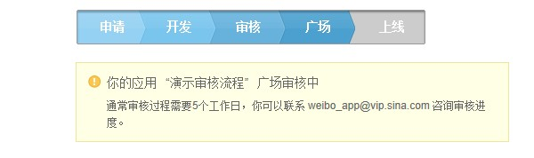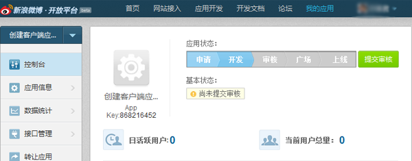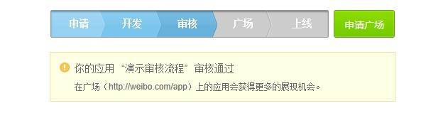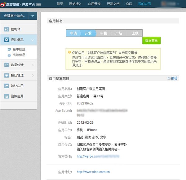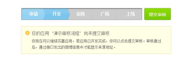 文案审核通过后,通过应用发出的微博信息将会在微博页面上显示来源信息,用户点击后会打开应用后台中填写的链接地址。此时应用后台会显示“提交审核”的按钮,点击后可以申请进入应用广场。