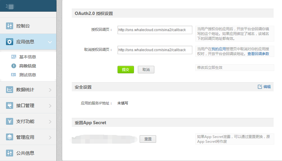 请在“我的应用 - 应用信息 - 高级信息”中填写您的应用回调页,这样才能使OAuth2.0授权正常进行。如果您的APPSECRET发生泄露,您也可以通过该页面中的重置按钮对其重置,如下图所示: