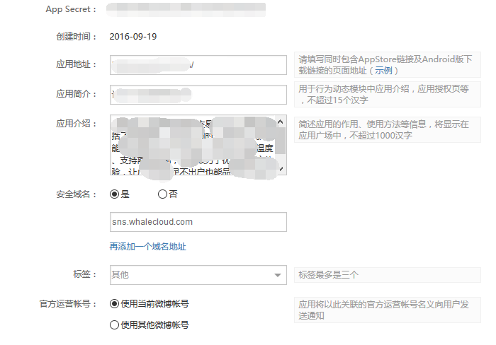注:授权回调页和取消授权回调页地址均为http://sns.whalecloud.com/sina2/callback。