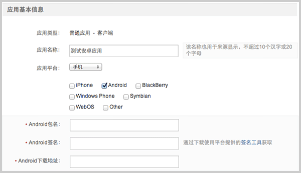 在“我的应用 - 应用信息”填写应用的平台信息