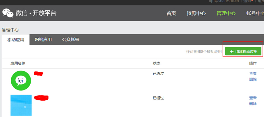 在您创建完应用后,点击并进入管理中心,进行支付申请;如果没有创建应用请根据上面流程进行创建。