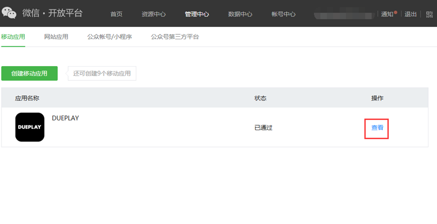 进入管理中心后,选择您将要进行支付申请的应用,点击【查看】,进入应用详情页面。