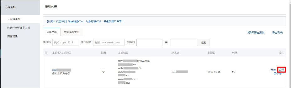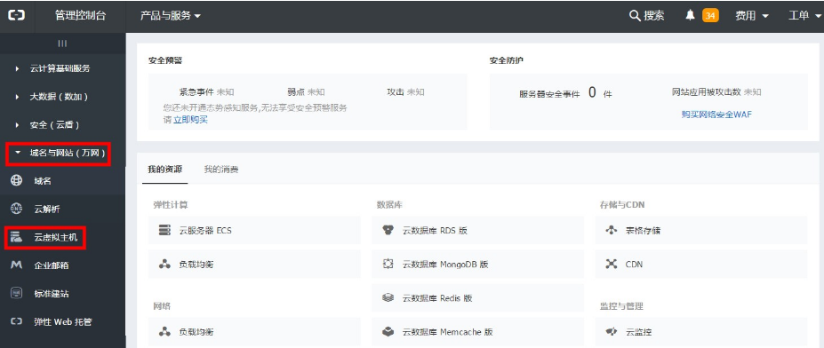 登录阿里云官网(www.aliyun.com),登陆购买服务器账户的管理控制台,点击左侧域名与网站(万网)-云虚拟主机。