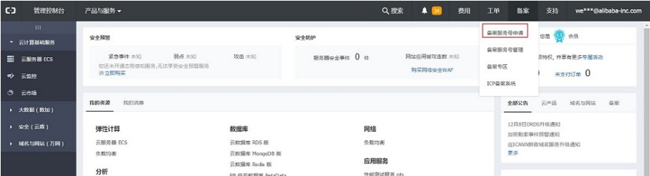 购买阿里云ECS服务器后,登录管理控制台,在右侧上方导航栏中选择备案-备案服务号申请。