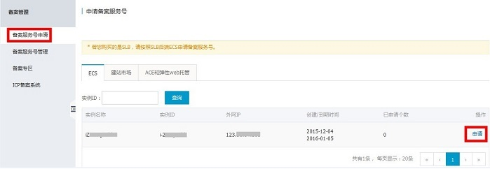 在备案服务号申请中的ECS产品类型中,选择您需要申请服务号的主机,并点击申请按钮。