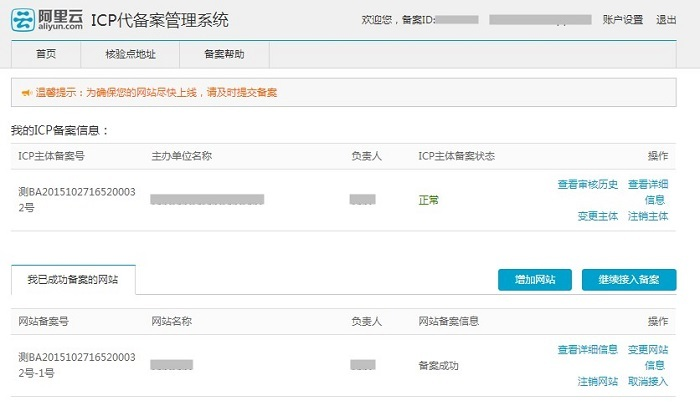 不同的产品验证方式也不同,万网主机,使用主机账号和密码验证;ECS服务器,使用备案服务号验证。