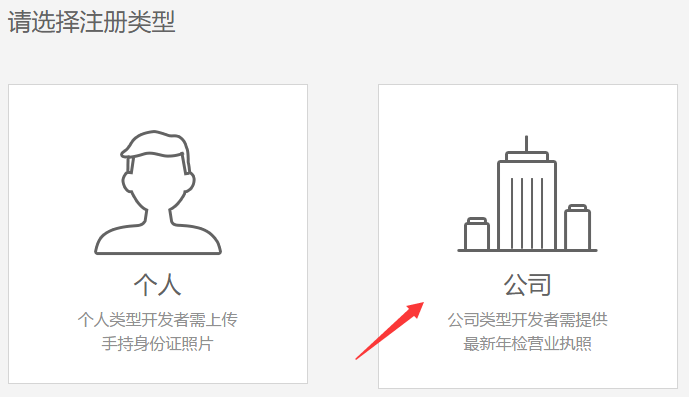 未取得开发者认证的个人或者企业,就会自动弹出注册认证页面。选择个人或者企业,由于多数为企业开发的应用,那么接下来就以企业为操作案例。