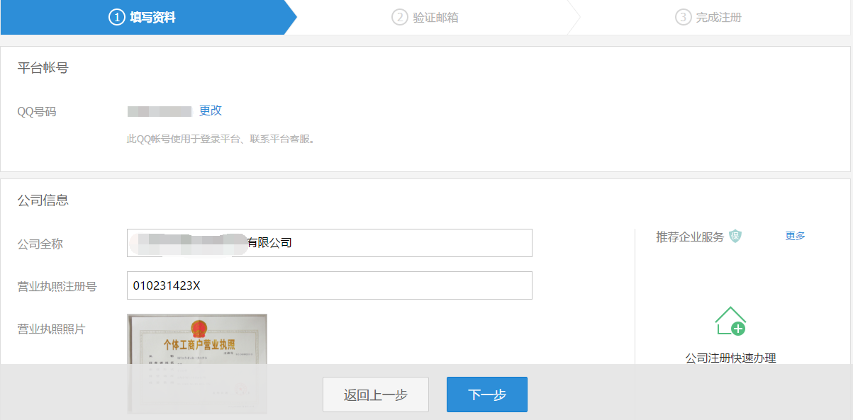 进入企业注册页面一共分为三步,第一步按照要求填写相应资料,注意上传图片的大小及格式。第二步通过邮箱验证,第三部即完成注册。随后是等待审核阶段,审核通过后会以邮箱通知,如有错误也会通知。按照要求进行修改重新提交即可。