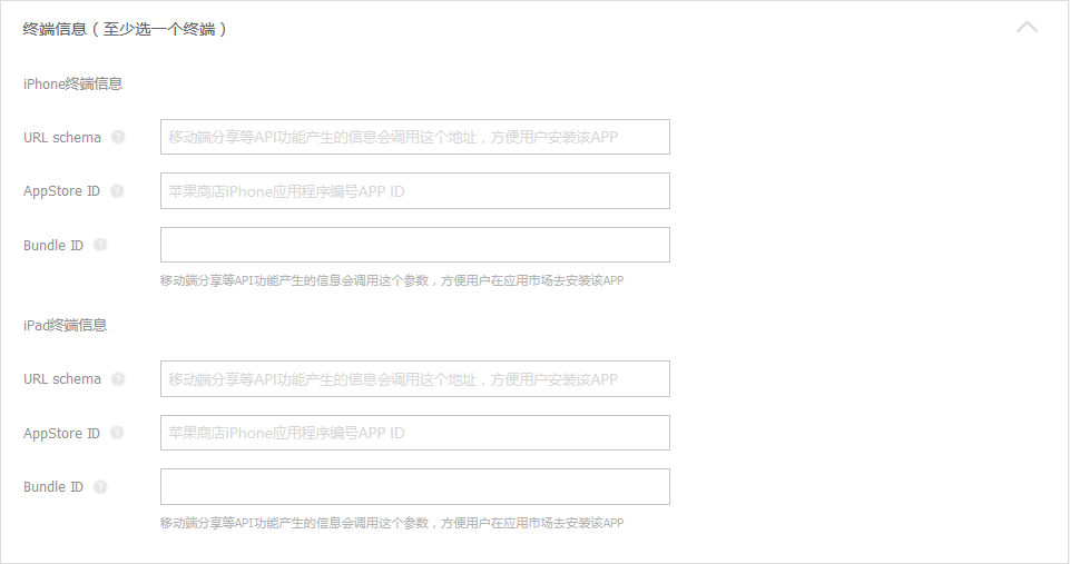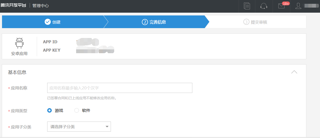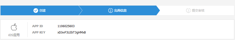 注意:在您点击【创建应用】是,平台会给您生成APPID和APPKEY请保存,用于社会化分享和第三方登录。