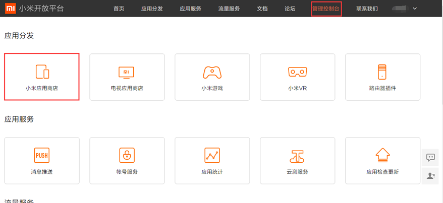 登录小米开放平台(http://dev.xiaomi.com/console).