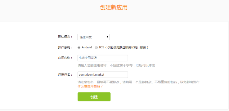 选择应用的默认语言、操作系统后输入您的应用名称,不超过20个字符,以后可以修改;并输入您应用的包名后点击“创建”按钮。