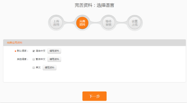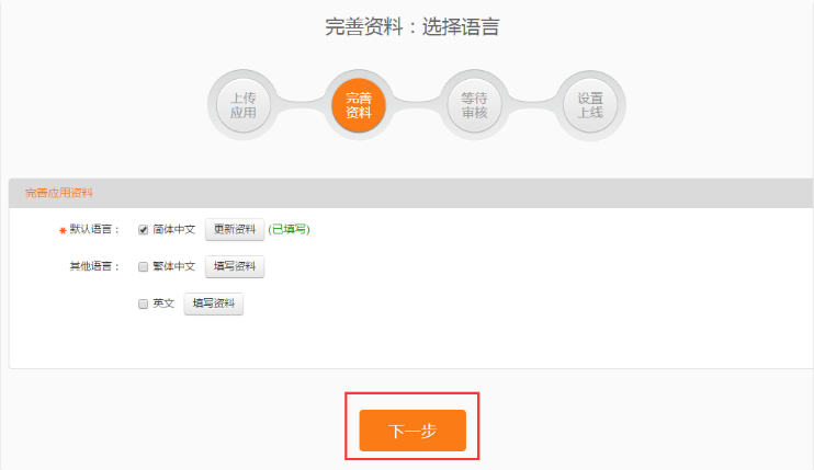 填写后点击“保存并返回”,填写其他语言的流程和此相同,填写完毕后点击“下一步”