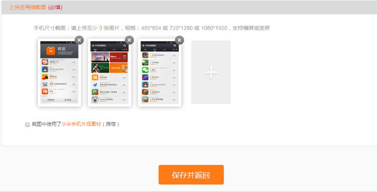 填写完整的应用资料后,提交应用截图,若您的应用类型为手机和平板,则需要上传两套应用截图(手机和平板各一套)