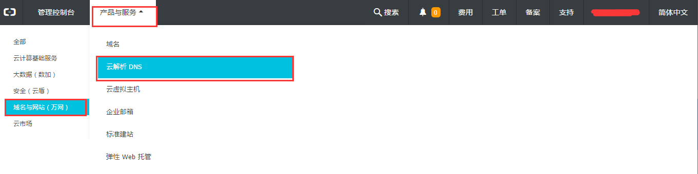 登陆阿里云/万网【管理控制台】,在顶部主导航位置点击【产品与服务】--【域名与网站(万网)】--【云解析DNS】,进入“域名解析列表”;