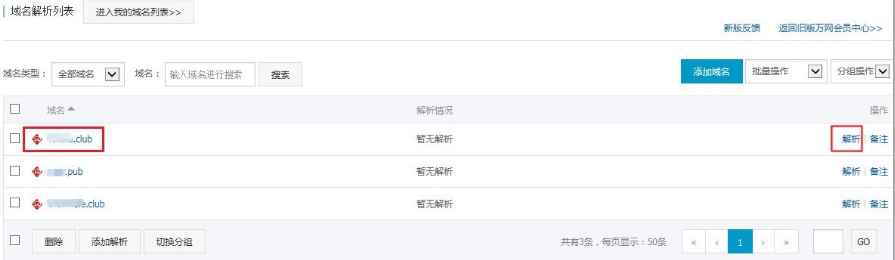在【域名解析列表】中,选择您将要解析的域名,点击【解析】按钮,进入解析操作。