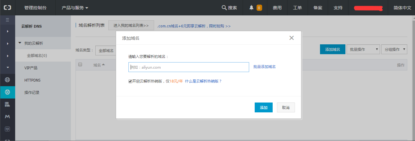 【提醒】非万网域名用户,进入“域名解析列表”后,点击列表右上方【添加域名】,在弹出框中输入您需要设置解析的域名,点击【添加】即可;添加成功后点击域名右侧【解析】入口,即可进入域名解析设置页。