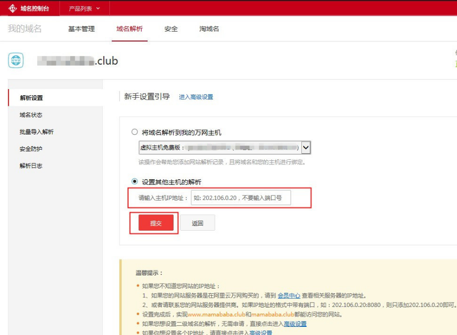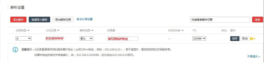 以将域名指向您的网站为例,对于新手用户,我们支持一键解析,您只需要填写网站的 IP 地址,即可完成解析。