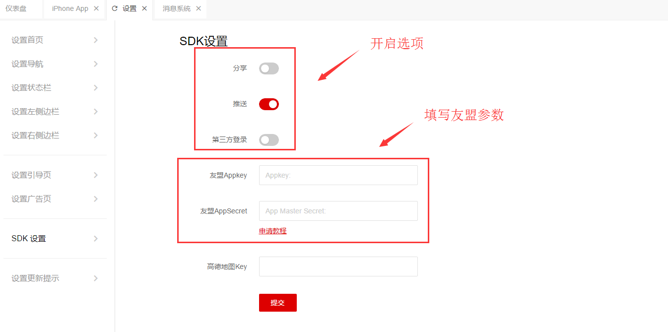 复制iOS AppKey和AppSecret,在响站后台左侧边栏点击系统 > APP > iPhone App(或iPad App) > 设置 > SDK设置,开启分享、推送或第三方登录,填入刚才复制的iOS AppKey和AppSecret。