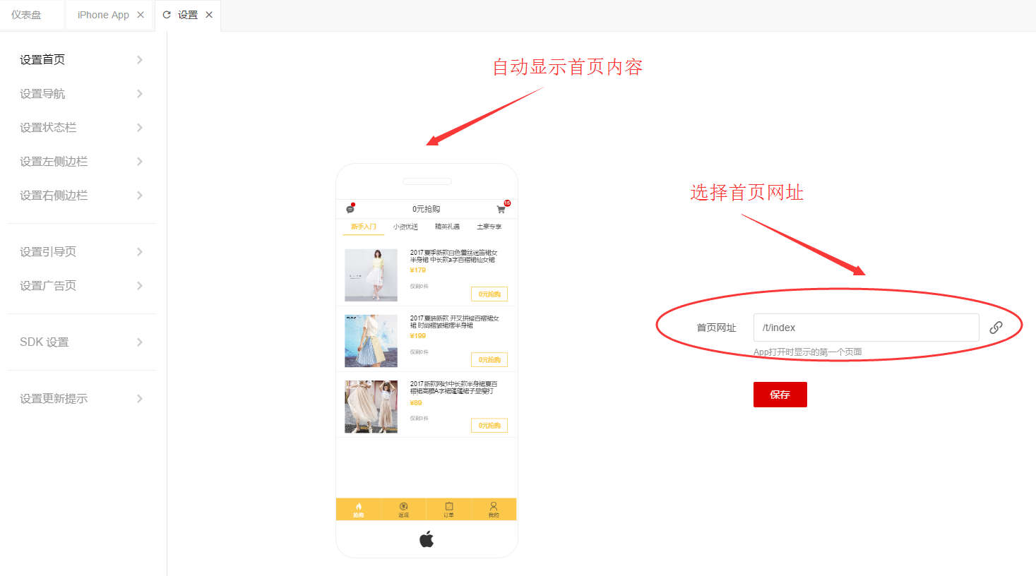 打开系统-APP-iPhone App(以及其他类型APP)-设置,点击设置首页,选择或填入页面网址。