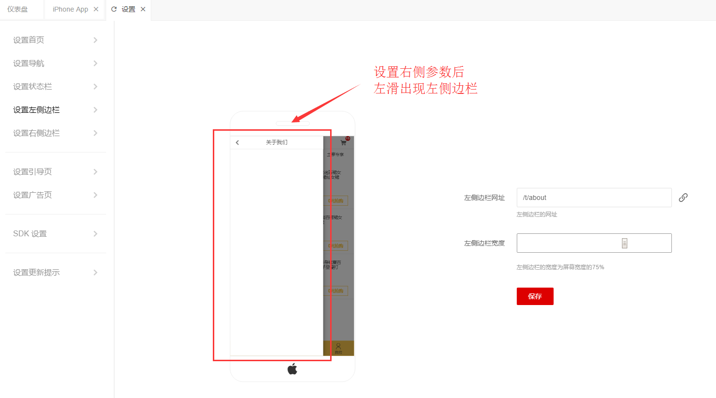 概述在移动端打开APP后,左滑出现右侧边栏,可根据具体场景添加。使用打开系统-APP-iPhone App(以及其他类型APP)-设置,点击设置左侧边栏。1、选择或填入左侧边栏网址。2、点击滑动调整左侧边栏宽度(手机屏幕宽度的10%至100%)。3、点击保存。