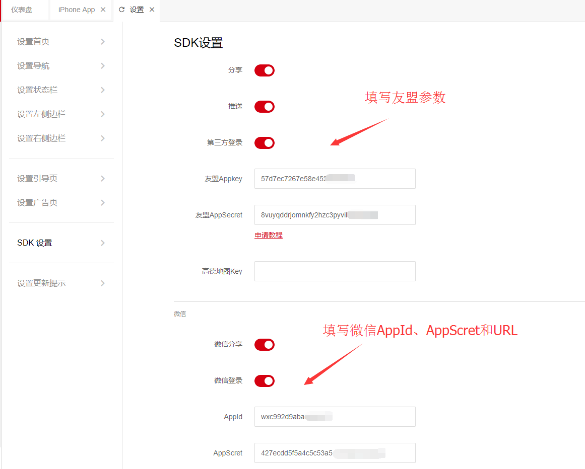 设置App的分享、推送、第三方登录的SDK信息。